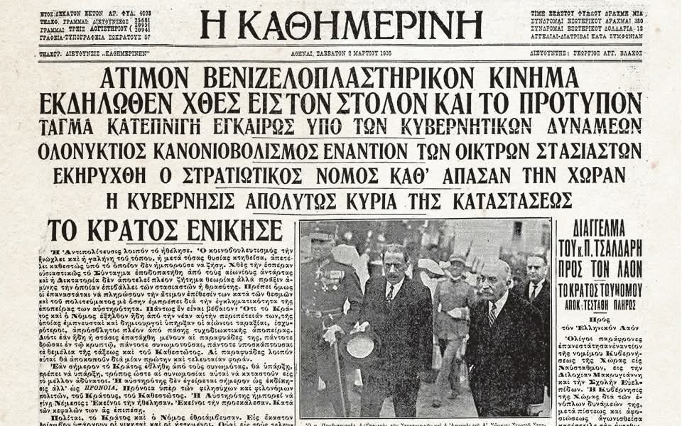 Ο αιφνιδιασμός της κυβέρνησης Τσαλδάρη και οι αρχικές επιτυχίες των κινηματιώνΤην 1η Μαρτίου 1935 ξέσπασε στη χώρα μας το μεγαλύτερο από τα δεκατέσσερα (!) μείζονα κινήματα της Α' Αβασίλευτης Δημοκρατίας (1924-1935). Επρόκειτο για μια αποτυχημένη απόπειρα πραξικοπήματος της βενιζελικής αντιπολίτευσης, απέναντι στη φιλοβασιλική κυβέρνηση του Παναγή...